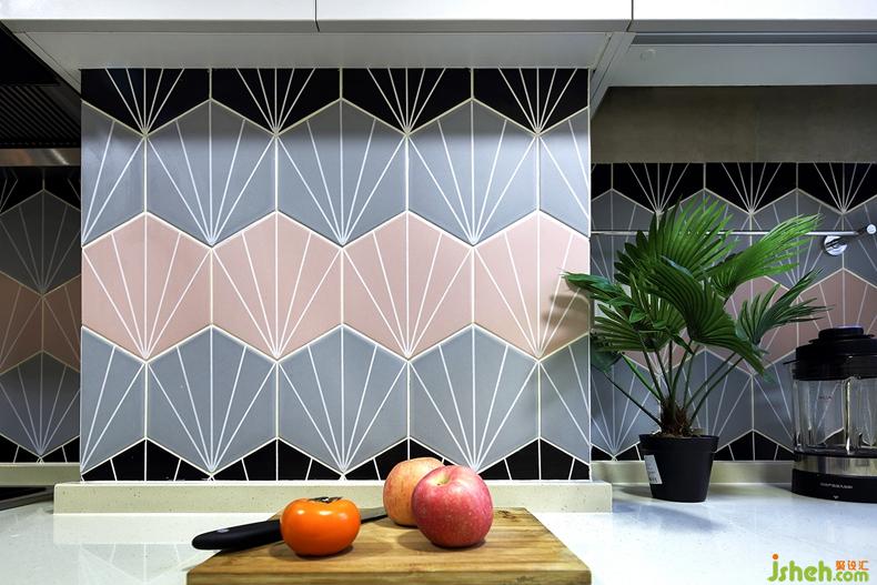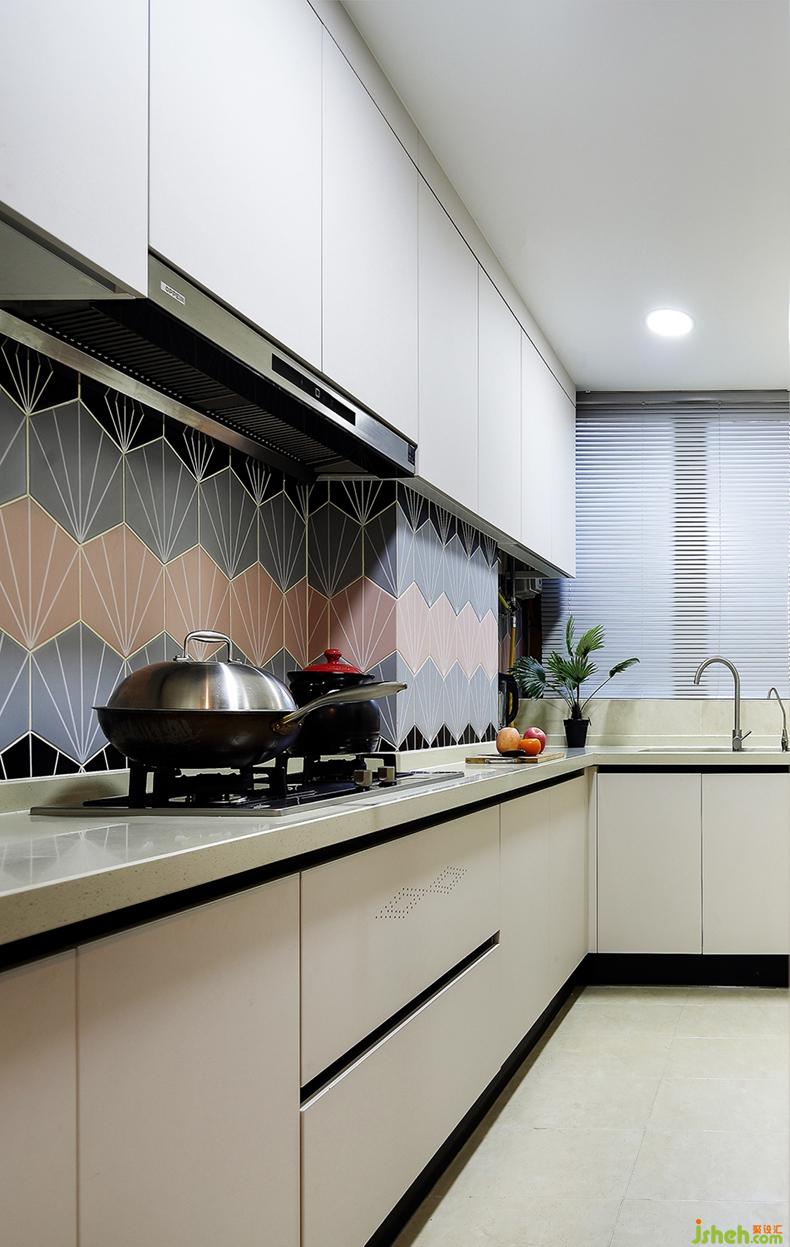 L型廚房,半開放的空間,沒有轉(zhuǎn)角的尷尬,簡單又實用。中間選用五彩不斑斕的墻磚,不一樣的紋理,是溫度與色澤的點綴,怡然自得。