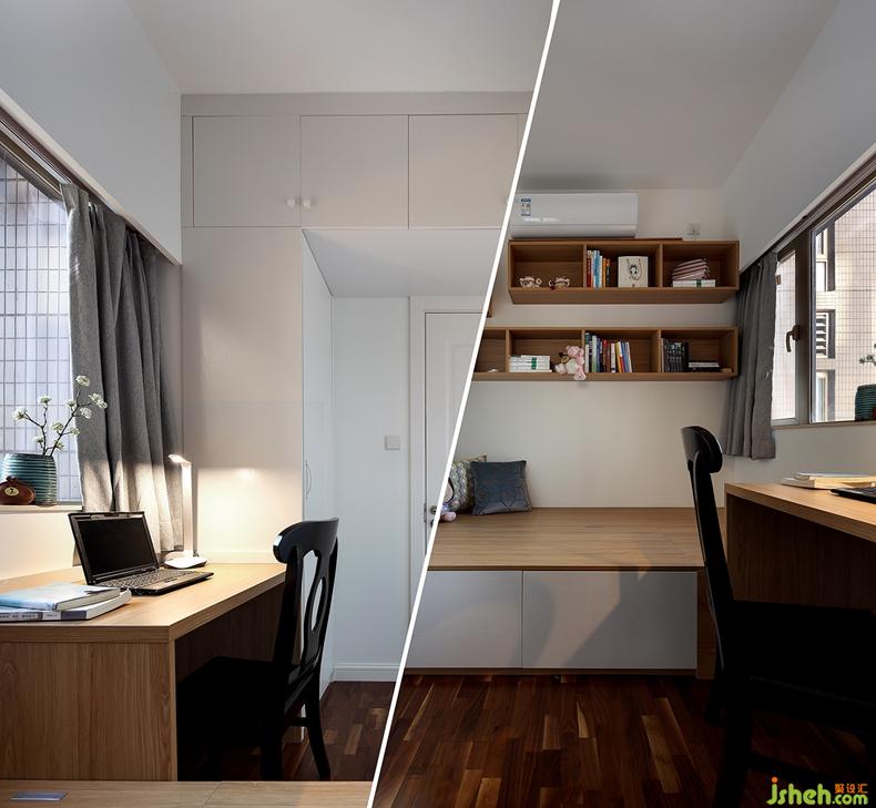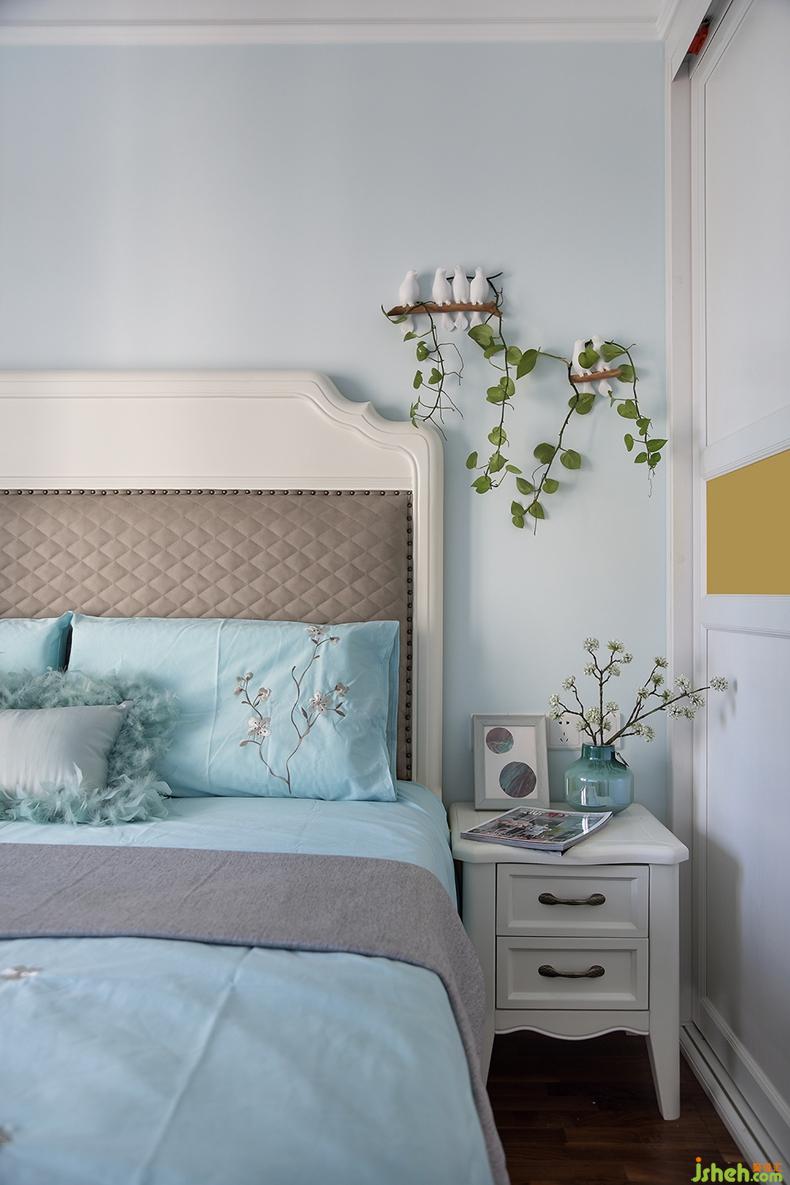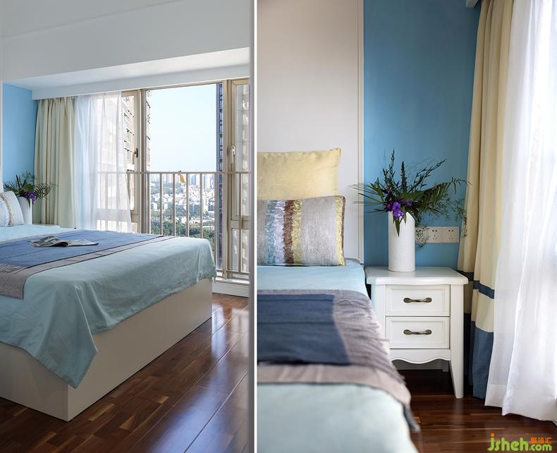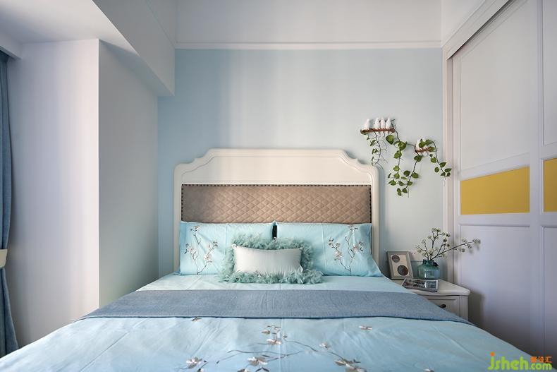 臥室墻面不似客廳的暖米色,而是選用了米白色;地面也鋪滿沉穩(wěn)溫潤的木色地板,搭配上藍(lán)綠色的床品,瞬間注入浪漫的基調(diào);床頭用藍(lán)白對比色也烘托出滿室的溫馨優(yōu)雅。設(shè)計公司