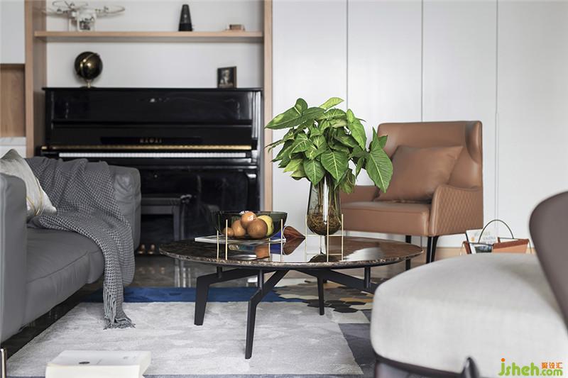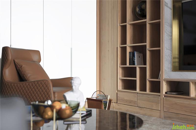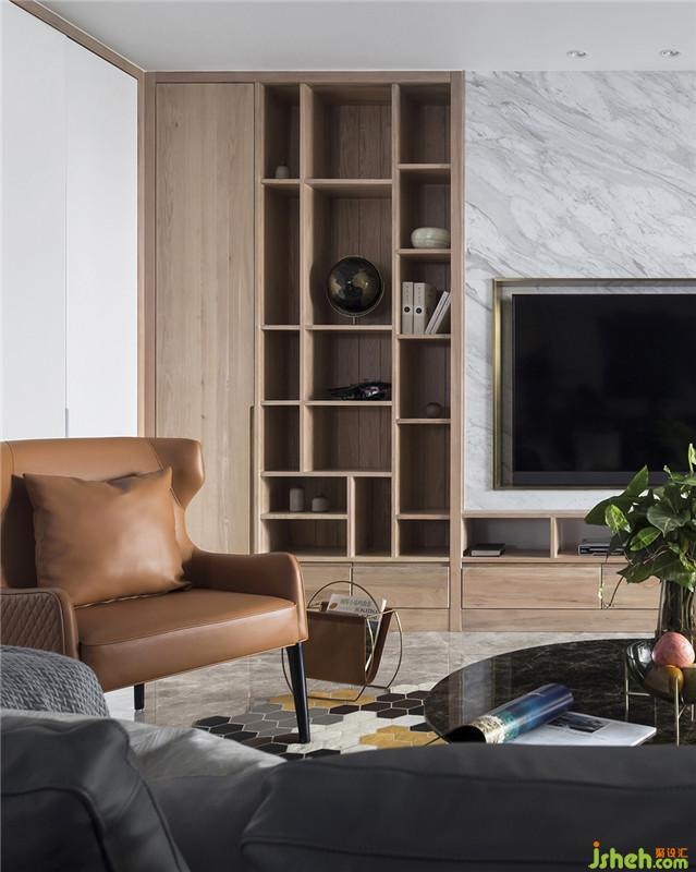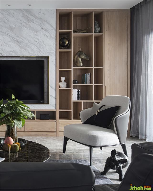 客廳電視背景墻打破統(tǒng)一材質(zhì)的刻板印象,由大理石與木制品的有機(jī)結(jié)合、開放式與隱藏式收納構(gòu)成。開放式收納處,根據(jù)需要展示的物品合理劃分了空間,待一一陳列上后,給人一種順心如意、所有事情剛剛好的感覺。