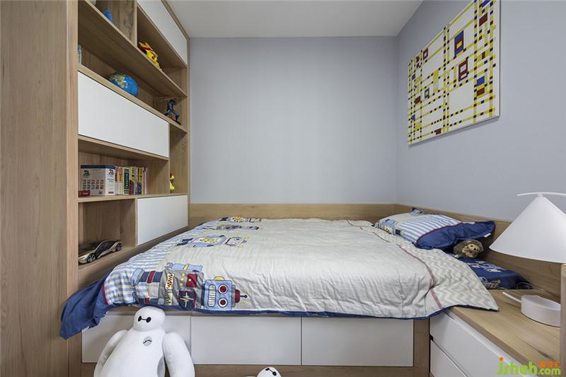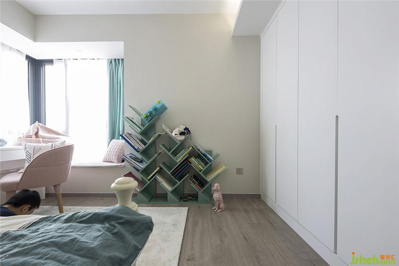 兒童房簡單清爽,必要的儲物空間仍以到頂柜子的形式實現(xiàn),一些課外讀物及小物件則可隨手放在側(cè)面的活動書架上。床前鋪有一大塊短絨地毯,給孩子圈出了一片玩耍的天地。