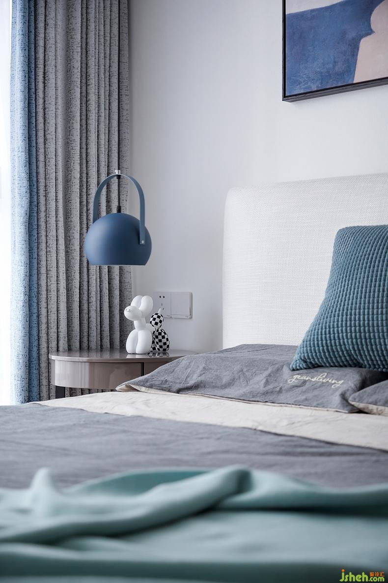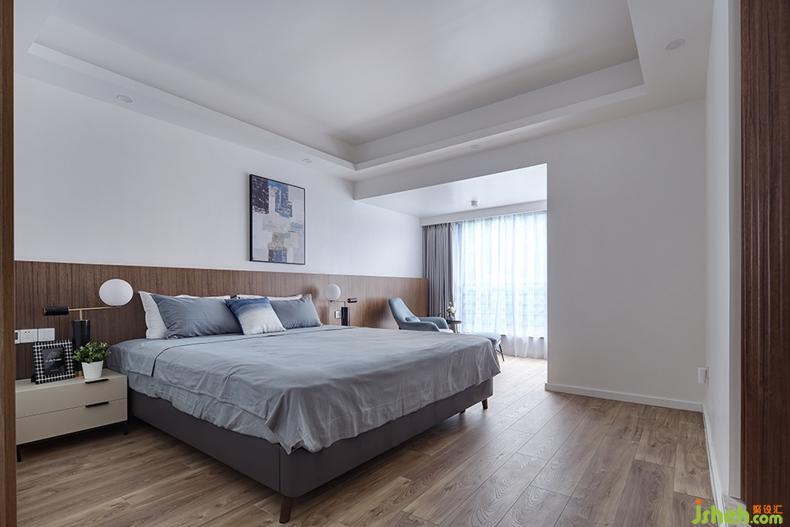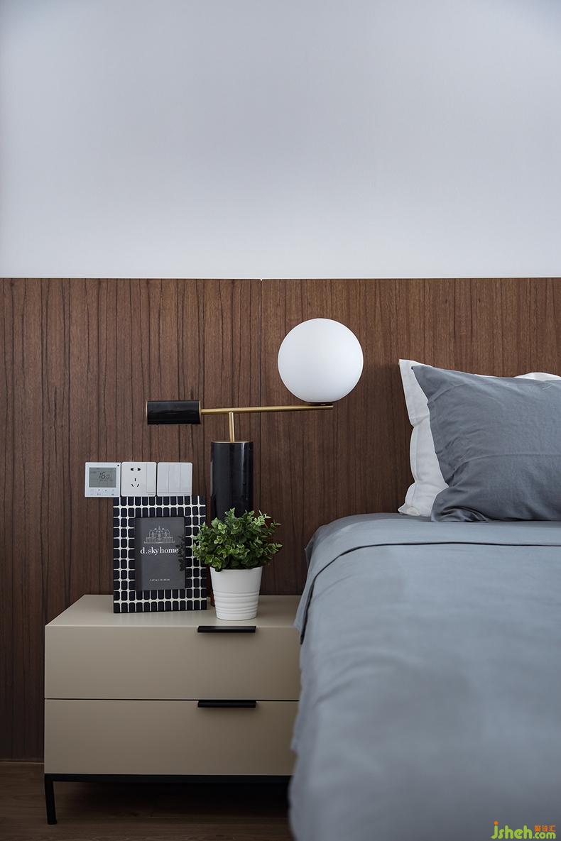 適當留白是當代藝術中的常用手法,主臥室便是如此,以靜謐的灰色床品搭配半高的木色護墻板,其上掛幅同色系的撞色掛畫,一切點到為止,沒有過于繁雜的裝飾,慵懶舒適的氛圍漸漸濃厚,給人帶來無限享受。