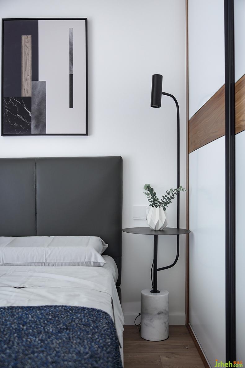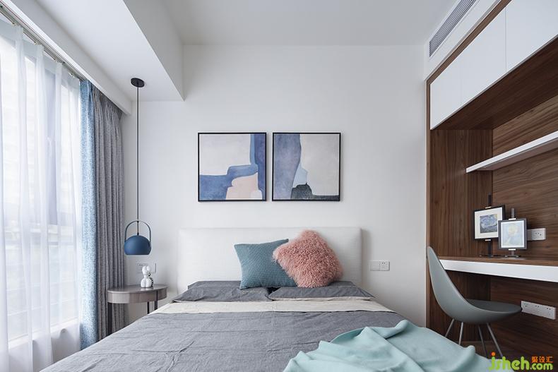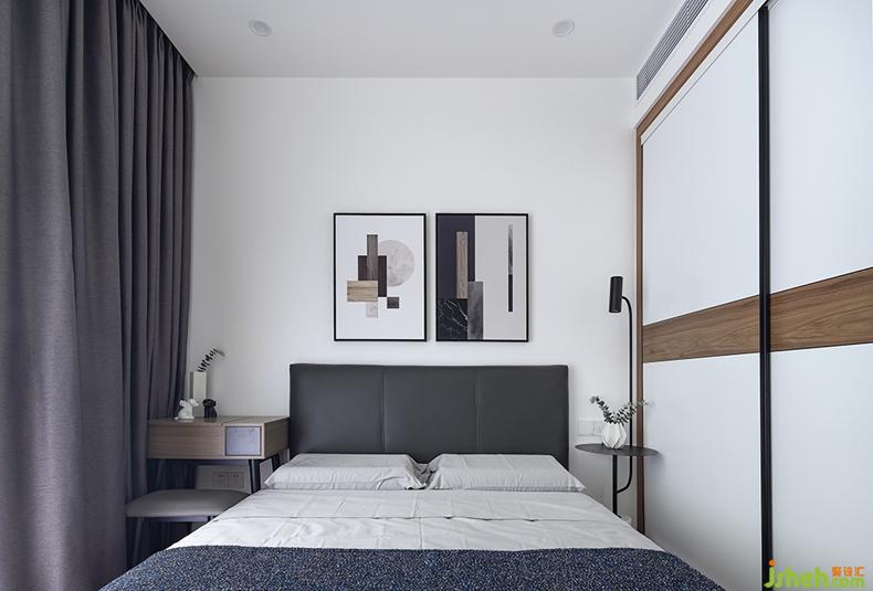 柔和的燈光,舒適的床品,只在角落隨性擺放一些小擺件,床頭掛上兩幅藝術掛畫。緊靠床邊的一體柜既可以當作衣柜又可以作為書桌,實用中不乏小巧思。各元素之間交相呼應,空間頓時溫馨起來了。