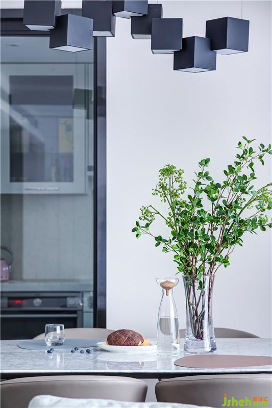 白色大理石臺面餐桌與米咖色皮質(zhì)餐椅可謂是絕佳結(jié)合,無論是色彩上的和諧過渡還是材質(zhì)上的剛?cè)岵记〉胶锰?。而精心挑選的組合分子吊燈則是營造空間氛圍的高手,其特有的表現(xiàn)力讓空間一秒變得時尚而有趣。再擺上一盆清新的綠植,空間更顯溫馨和活力。