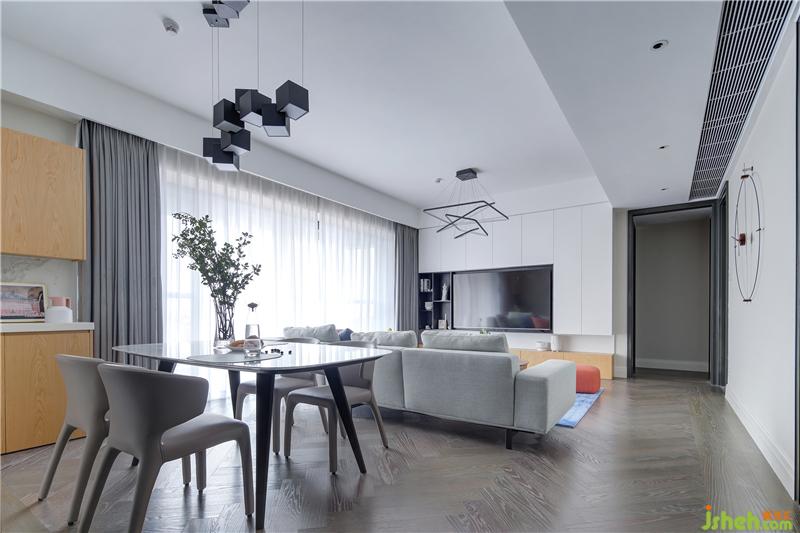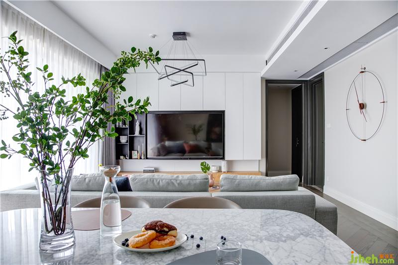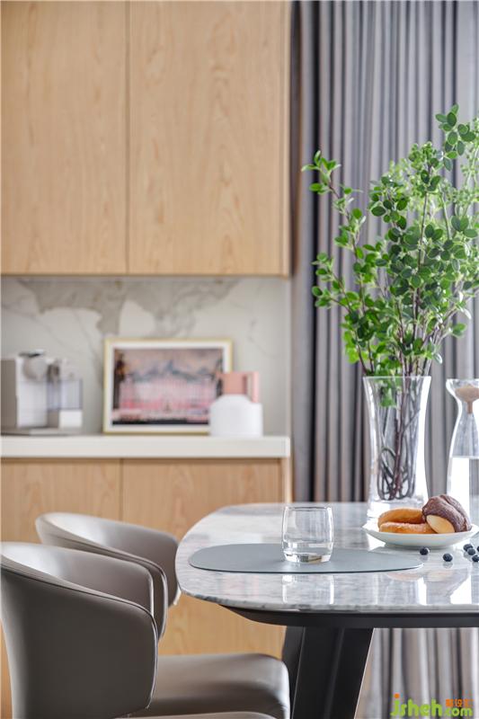 餐廳緊靠窗簾位的一側(cè)定制了木色餐邊柜,因其厚度遠(yuǎn)大于窗簾盒厚度,到頂?shù)脑O(shè)計會造成與天花的收口問題,便根據(jù)現(xiàn)有寬度進行了鏤空的造型處理。臺面和中空位則選用巖板帶過,其紋理清晰、富有層次感,色澤又帶有細(xì)微的明暗變化,給人一種高貴、雅致的感覺。溫和的木色與鏤空的造型和電視背景墻巧妙呼應(yīng),讓人不禁感嘆:環(huán)環(huán)相扣。室內(nèi)設(shè)計師