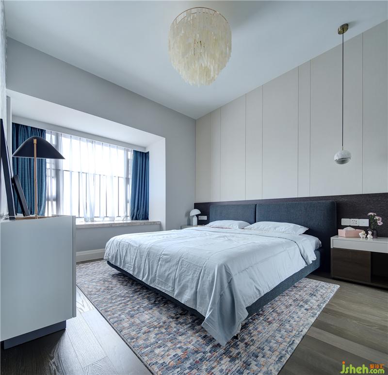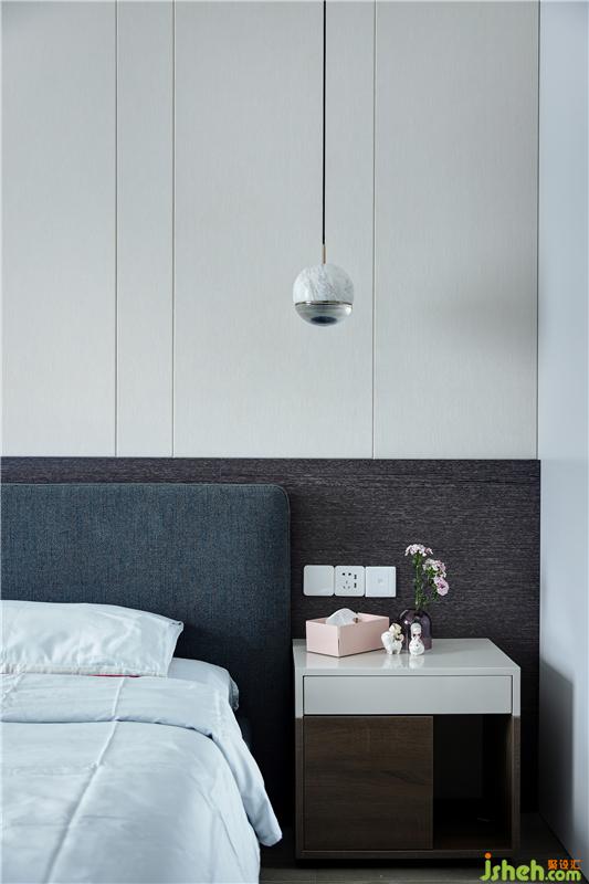 素雅的藍(lán)色、柔和的米色、偶爾出現(xiàn)的一抹黑色,奠定了主臥舒緩的主旋律。主臥最吸睛的莫過于業(yè)主鐘愛的貝殼燈,它由貝殼制作而成,當(dāng)中間的燈泡點亮?xí)r,燈光會透過各個貝殼折射出來,極具韻味,浪漫而溫馨。而除了照明功能外,貝殼燈平時也可視為裝飾品,令人賞心悅目。室內(nèi)設(shè)計師