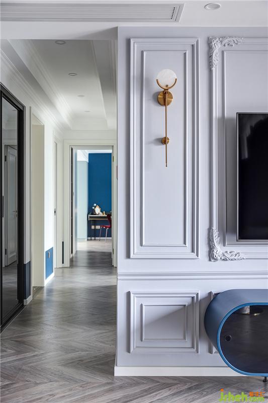 電視墻采用法式輕奢風格特有的幾何設(shè)計元素,通過PU線條的剪裁,打造方正的矩形和疏密有致的線性框架,立體的質(zhì)感也成就了視覺拉鋸,增加了電視墻的藝術(shù)氛圍。以電視為中心營造了左右對稱的平衡感,強化了電視墻的儀式感,而兩側(cè)的環(huán)抱款輕奢壁燈豐富了空間照明的層次,在灰色底漆的襯托下散發(fā)出典雅大氣的光芒。