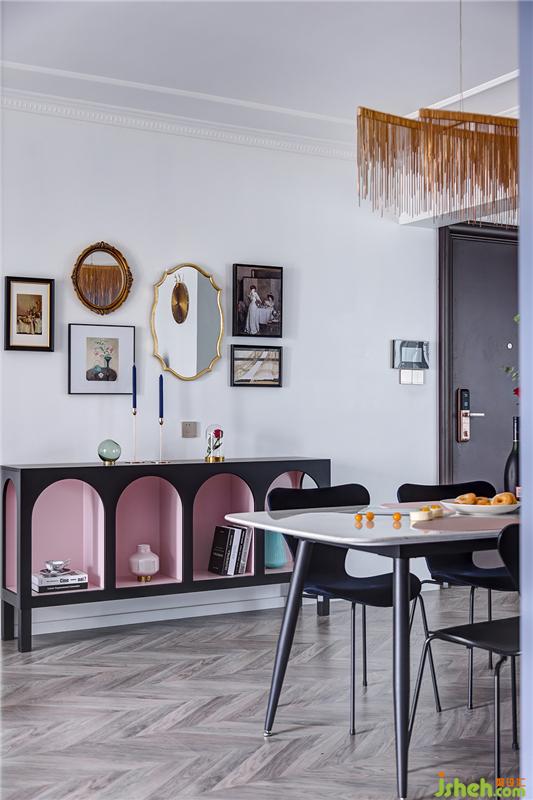 進門便是一抹明媚搶眼的粉色,穿透在黑色烤漆餐邊柜里,點亮一室的輕奢氣息。柜子借鑒了建筑設(shè)計中的拱形結(jié)構(gòu),活潑且極具陣列構(gòu)造感,鏤空半滿的造型洋溢著輕奢的氣息,為空間增添活力,帶來滿滿的藝術(shù)格調(diào)。