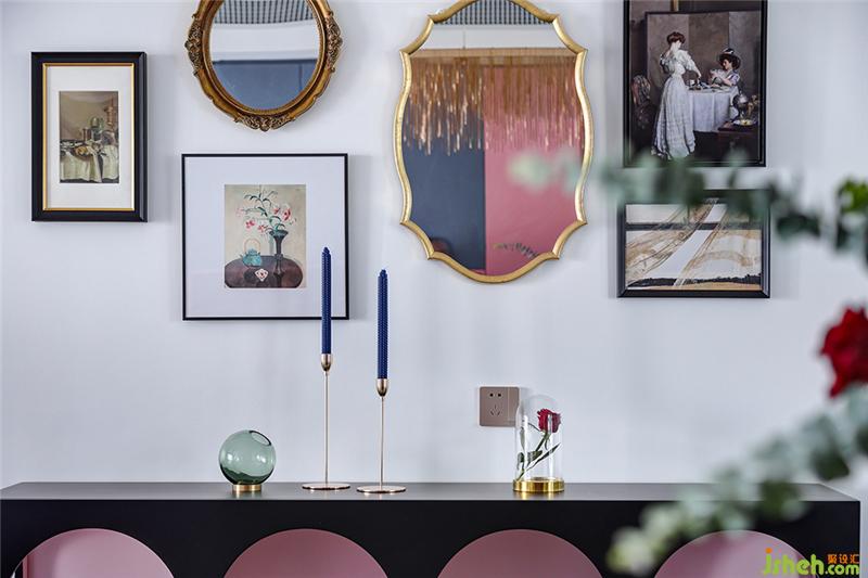 墻面可謂是最好的風景展示區(qū),餐邊柜上懸掛六項規(guī)格不一的裝飾,既有家庭場景的復(fù)古油畫又有精致典雅的鏡子,看似毫無關(guān)聯(lián),但都極具生活氣息,精心設(shè)計過的排列方式也讓餐廳增添了別樣的美感,成為家中一道亮眼的風景線。