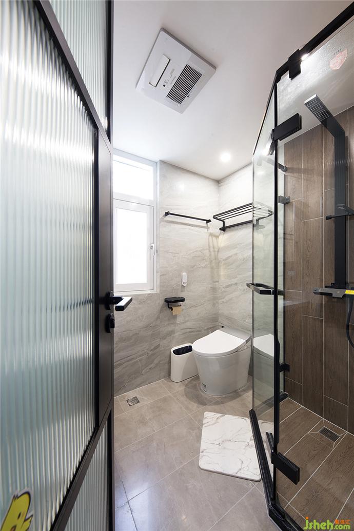 衛(wèi)生間利用夾角位做了鉆石型淋浴房,巧妙實現(xiàn)干濕分離,而墻地一體通鋪的木紋磚也明顯區(qū)別于其它位置的瓷磚,不僅顏值高,還極具時尚品味。