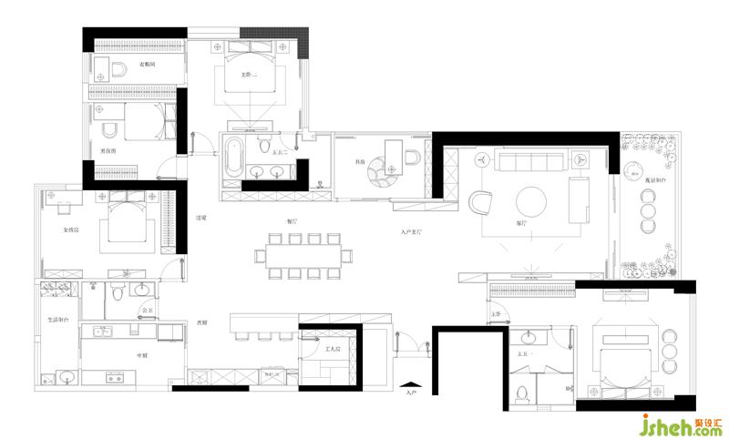 業(yè)主希望設(shè)計(jì)更開放、藝術(shù),除了臥室外,都不希望太生活化。房子面積比較大,需要盡量顯得大氣、突出空間感。同時,兩代人一起居住,在功能方面需要考慮周全。