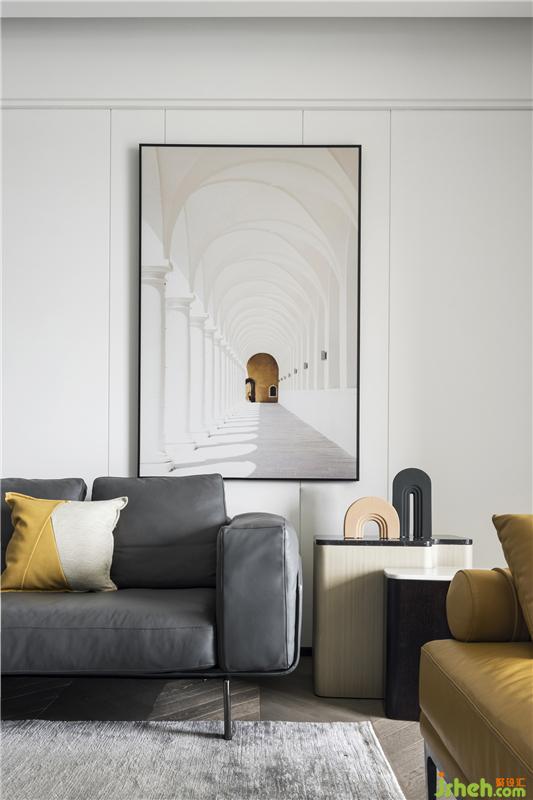 客廳圍合布局式家具突破了造型的限制,讓空間更為靈活寬敞。沙發(fā)后帶拱門元素的掛畫與邊幾上弧形擺件相呼應(yīng),構(gòu)建了抽象與現(xiàn)實(shí)的氣質(zhì)聯(lián)結(jié),為空間增添許多生活意趣。