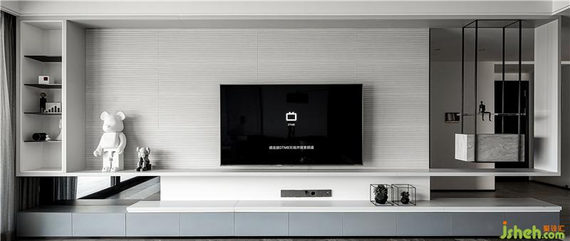 轉(zhuǎn)而看向電視背景墻,右側(cè)類似解構(gòu)主義手法的懸掛設(shè)計(jì)打破了空間的限制,令人眼前一亮!