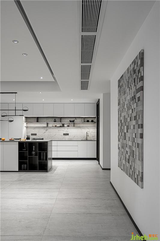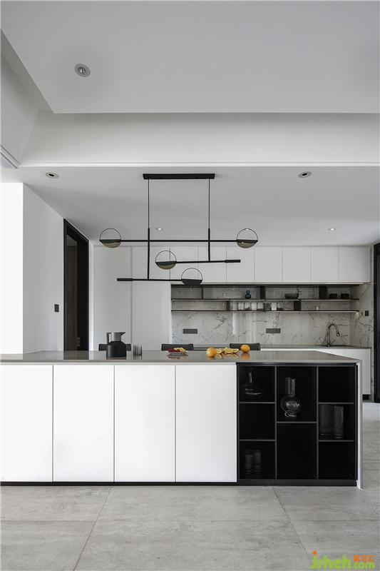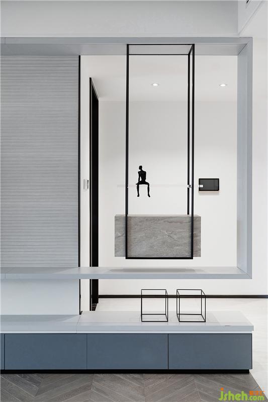 黑色鋼條與大理石、烤漆板和瓷磚之間的體塊穿插和組合讓空間更有趣味,同時(shí)也便于業(yè)主及時(shí)看到入戶(hù)情況,而從外往里看則會(huì)覺(jué)得內(nèi)有乾坤,空間更有延伸感。