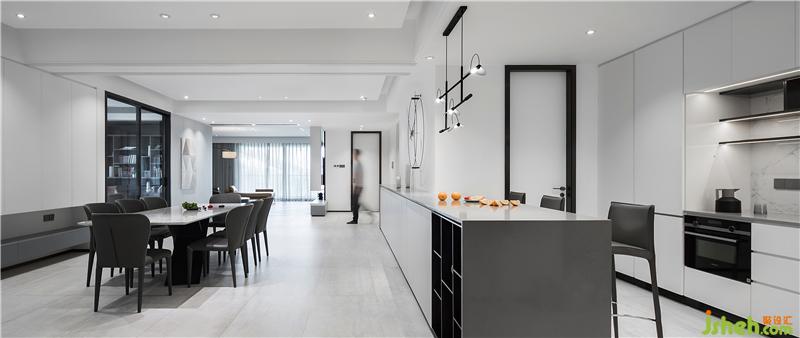 吧臺(tái)白色巖板臺(tái)面與半封閉式的烤漆柜門(mén)相互映襯,吧椅則選用與開(kāi)放柜同色系的灰色,白灰之間有藏有露,讓空間更為靈動(dòng)。長(zhǎng)吧臺(tái)的工藝難度極高,除了收口細(xì)節(jié)需到位外,在12扇柜門(mén)之上的臺(tái)面還需保持高平整度。
