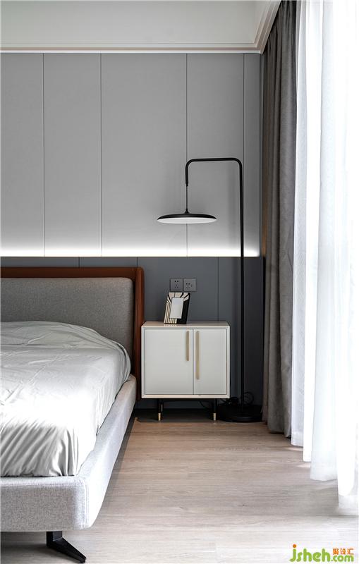 臥室主色調(diào)與公共區(qū)域的黑白灰相對(duì)應(yīng),赭石色的床頭造型并入灰度遞增的硬包與護(hù)墻板,搭配富有創(chuàng)意的燈具和床頭柜,細(xì)節(jié)之處表現(xiàn)出的藝術(shù)品味讓心靈得以放松和休憩。
