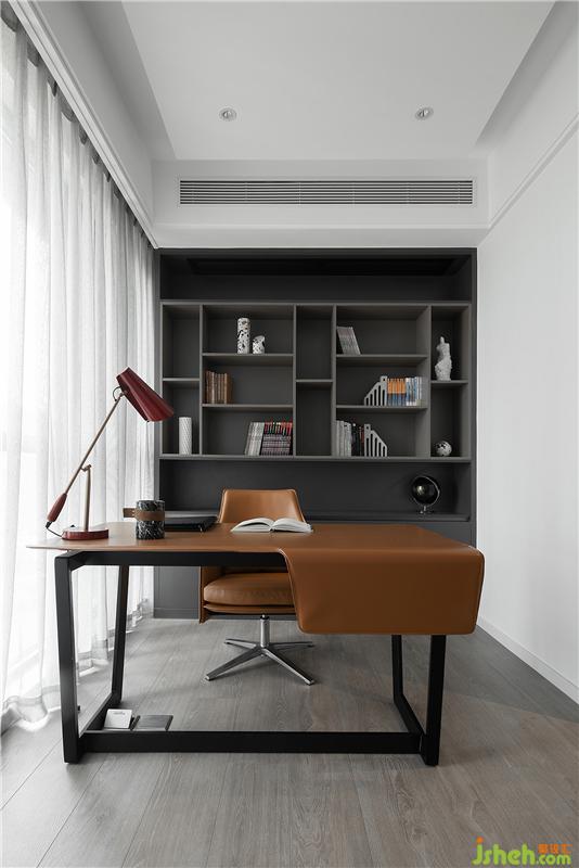 書(shū)房以黑色、白色和木色為基調(diào),搭配亮眼的咖色軟裝,以簡(jiǎn)潔大氣、有設(shè)計(jì)感的造型讓空間充滿(mǎn)藝術(shù)氛圍。