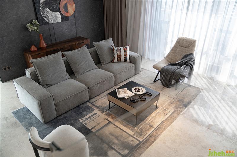 暖灰色布藝沙發(fā)和深色木制儲(chǔ)物茶幾、暖白色休閑椅相當(dāng)搭配,款式新穎又休閑舒適,充滿美好且文藝的氣息。