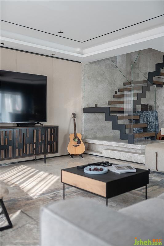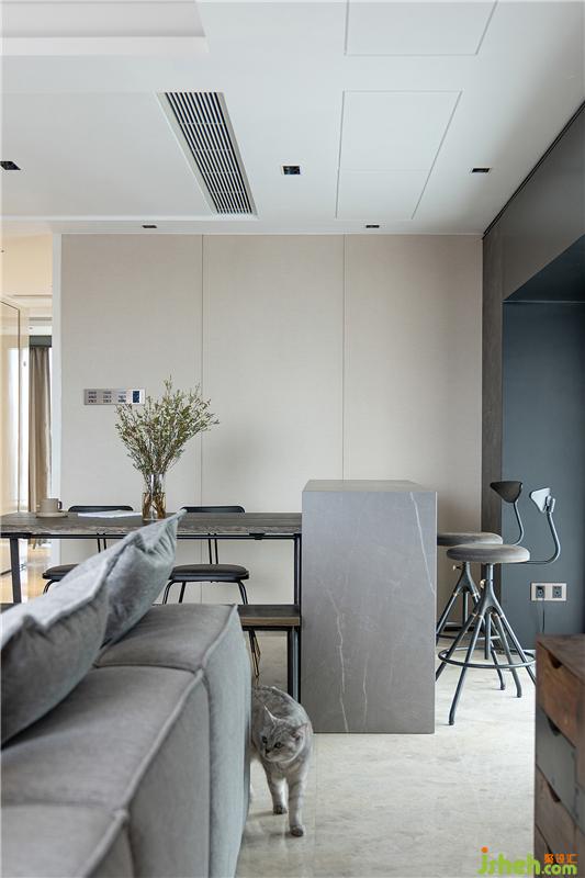 客廳選擇了較多質(zhì)感柔軟、細(xì)膩的家具,給室內(nèi)增添溫馨、舒適的感覺(jué),同時(shí),中和了冷硬的地面與背景墻,展現(xiàn)出工業(yè)風(fēng)的獨(dú)特美感。