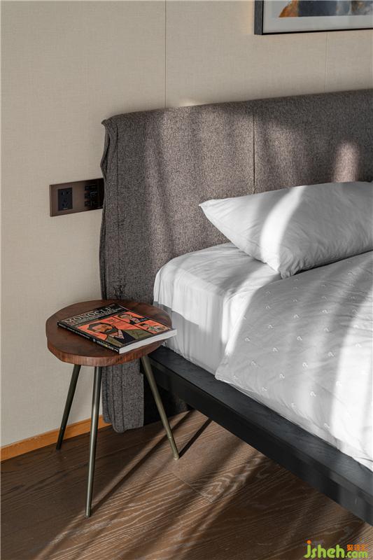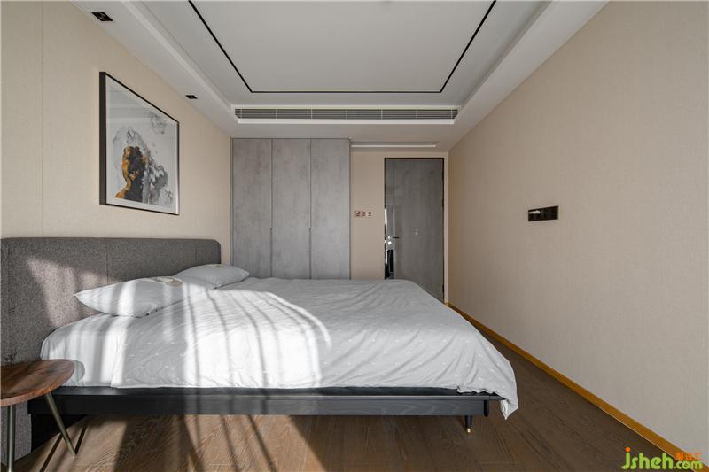 次臥延續(xù)其他空間的色彩調(diào)性,由于采光較好,家具和衣柜均選用了高級灰色,增強了色彩對比,令空間更加明快。床頭背景則懸掛一幅蘊含空間主色的抽象掛畫,簡單利落又有個性。