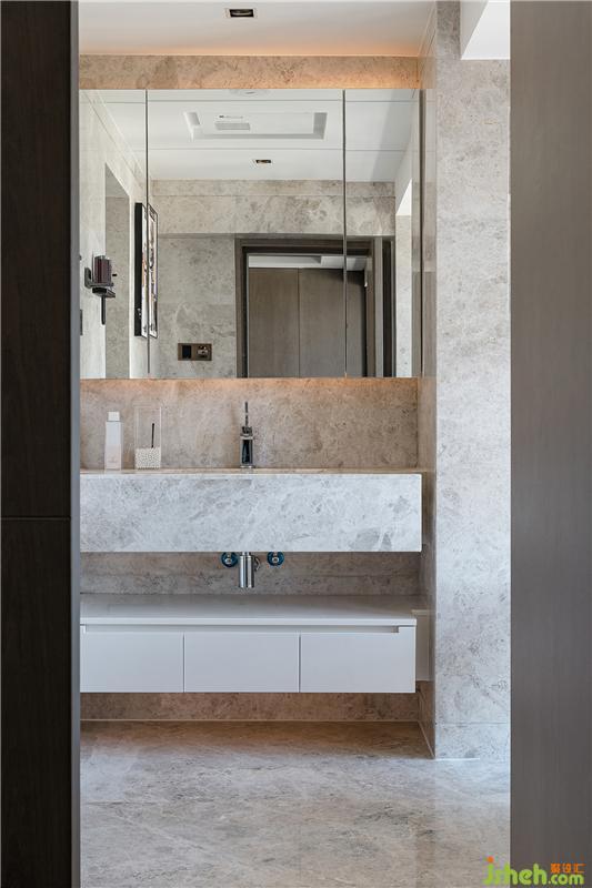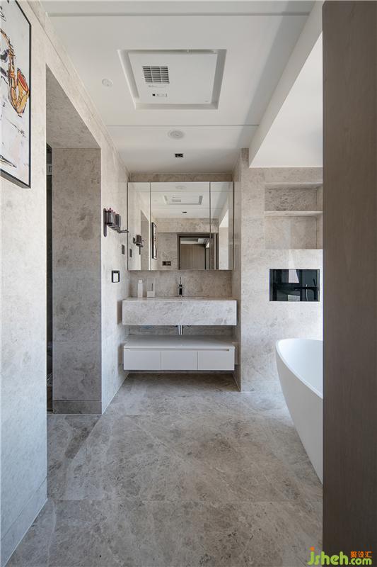 主衛(wèi)通鋪淺色暗紋大理石,搭配內(nèi)嵌式臺盆、定制同款浴室柜,整體感非常強,視覺上也增大了空間感。三分離的設計讓空間的使用舒適感大大提升。入門處懸掛了一幅同色系抽象掛畫,即便是在洗漱時,也能感受到美好。