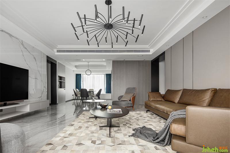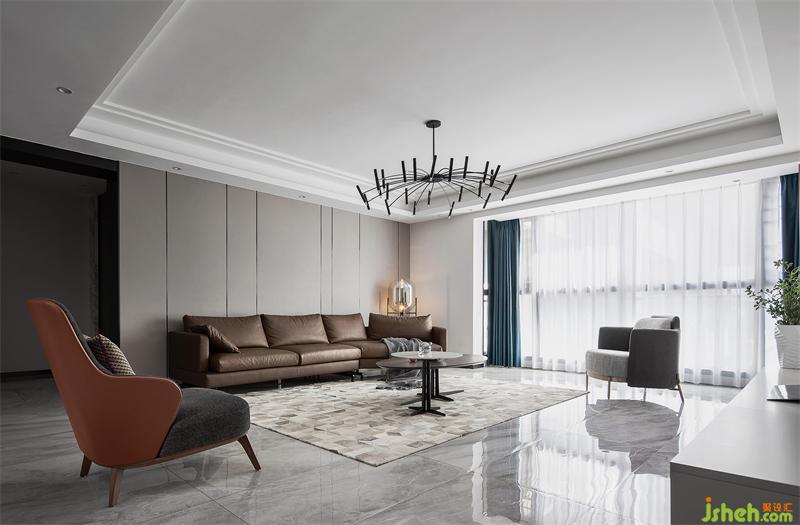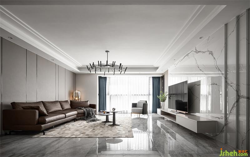 室內以簡練、優(yōu)雅、舒適為設計核心,通過材質、色彩、線條等元素,構建清爽、舒適的生活空間。公共區(qū)域地面通鋪大理石紋磚,天花以周邊吊頂形式將空調與筒燈藏于其內,立面則以暖灰色皮質硬包與淺色大理石紋磚作為材質及顏色之間的碰撞,凸顯空間開闊、大氣之感。