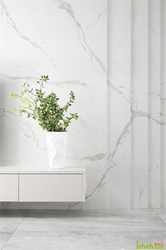 電視背景墻以大理石紋磚依次疊加并重組線條感為設計亮點。紋路自然延展、右側恰好形成梯度線條,與定制的條形電視柜組合成立體的空間。清新的色彩搭配讓室內盡顯輕松、靜謐,小瓶綠植更讓空間充滿舒適的居家氛圍。