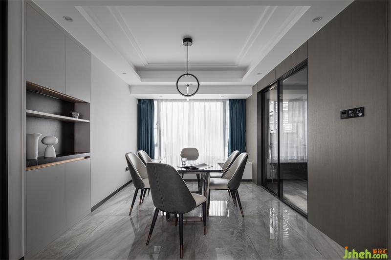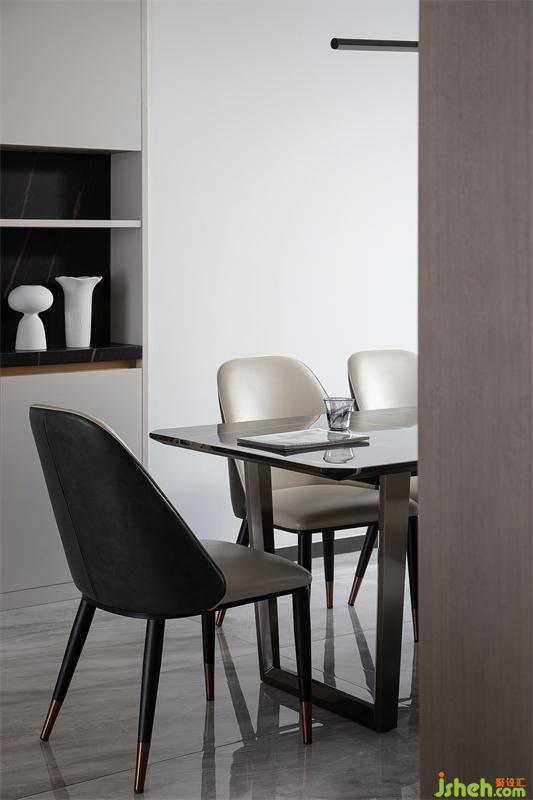 餐廳延續(xù)客廳立面色彩深淺碰撞的家居設計手法,深色面是自入門至窗沿的通頂護墻板,淺色面則沿原墻位順勢設計了內嵌式收納柜,細節(jié)之處彰顯簡約雅致的藝術氣息。