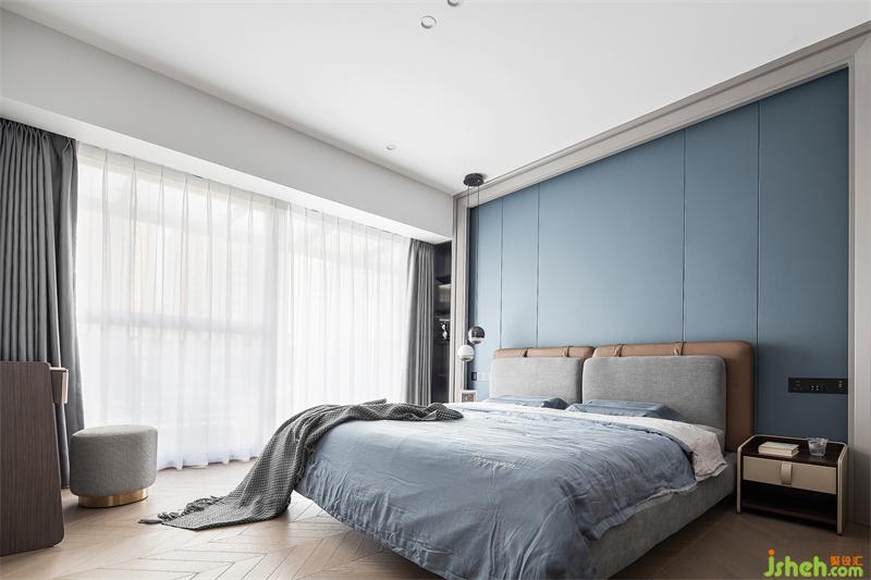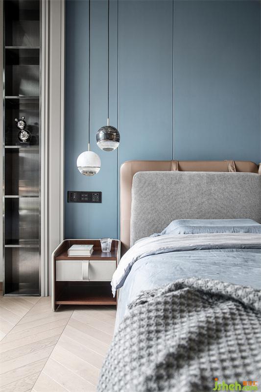 步入主臥,溫柔的藍色讓人不由自主放松、沉靜下來。依靠實木、硬包、皮質、布藝等多材質的搭配所創(chuàng)造的豐富質感,打造了一個自由、舒適的休息空間。充分利用戶型特點,沿梁位而設一列收納格,既是紀念品的展示位,也是隨手小物件的安放處。