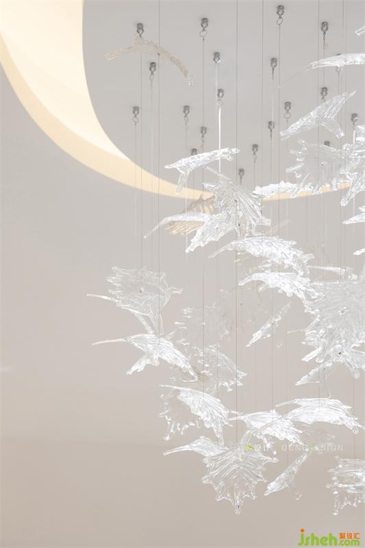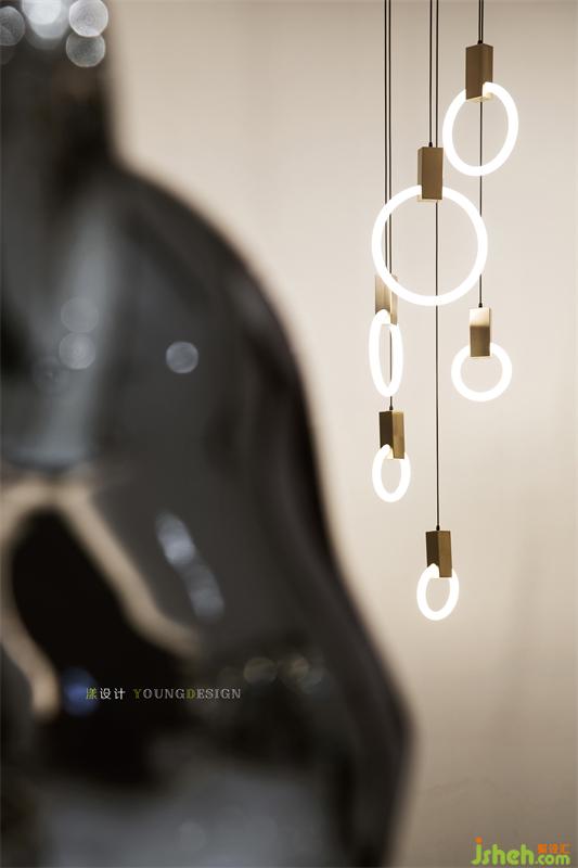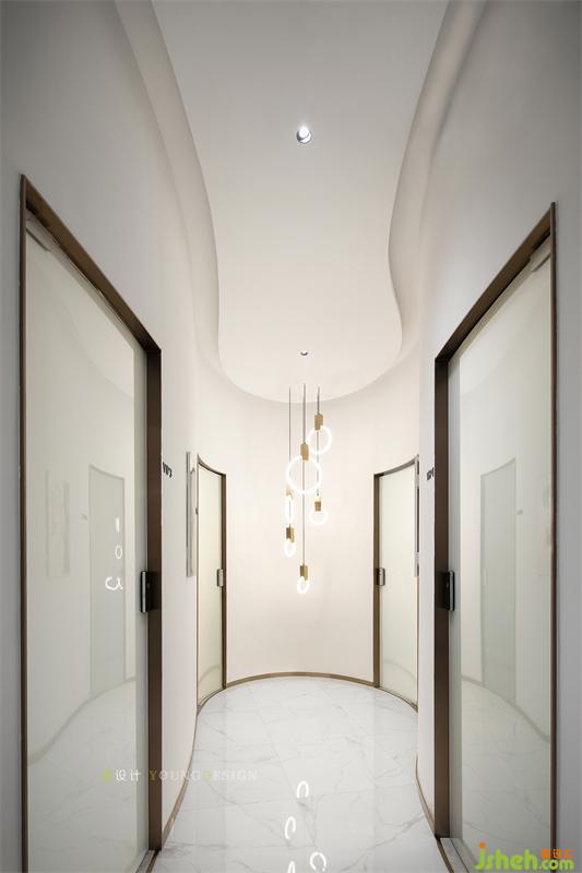 光滑透亮的大理石紋磚、晶瑩通透的玻璃門、高級精致的金屬元素,過道空間在環(huán)形吊燈的映照下,洋溢著干凈靈動的氣息。