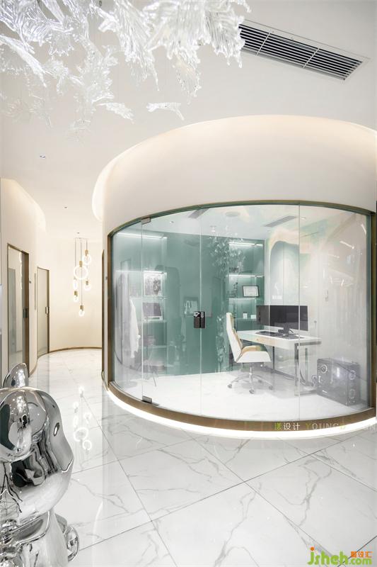 空間以純凈的白色作為主色調(diào),搭配優(yōu)雅神秘的復(fù)古綠,用色彩純度形成的色塊構(gòu)成立面造型;以柔和流暢的弧形帶動視線轉(zhuǎn)移,順勢而為的異形造型則將空間巧妙貫穿;搭配電子霧化玻璃和多重光源,打造時尚個性、優(yōu)雅輕奢的商業(yè)空間。