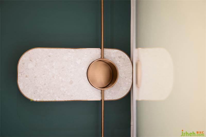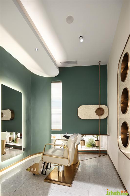 VIP室延續(xù)整體輕奢基調,以復古綠為主背景墻色,側面設計了造型簡約但實用的開放式金屬置物架,必要的鏡面也巧妙置入其中。家具的選擇也十分講究,強化了造型的簡約性及金屬色的相互呼應,營造出空間靜謐、優(yōu)雅的氛圍。