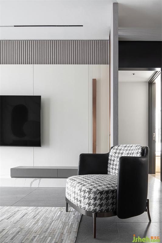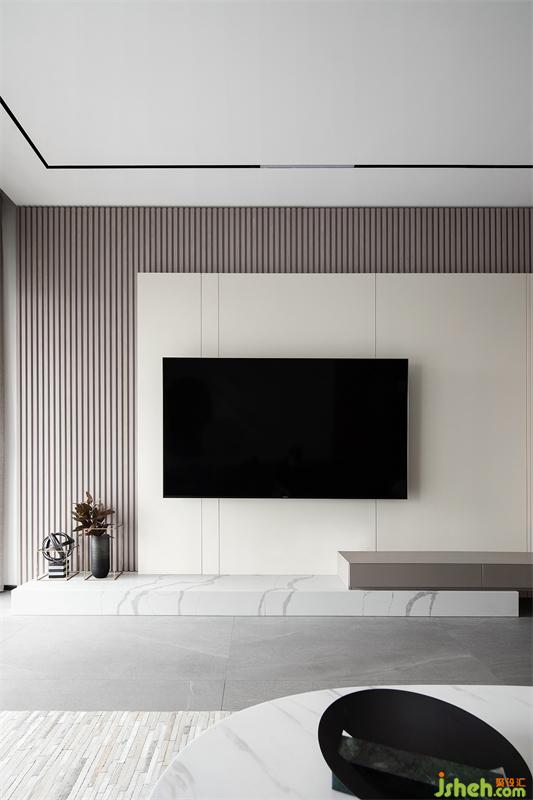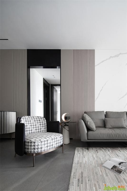 時尚個性的黑白灰基底,穿插使用優(yōu)雅的灰咖色,構(gòu)成了客廳空間的色彩基礎(chǔ)。電視背景墻富有層次,由大理石+木擱柵+混油護(hù)墻板構(gòu)成,自下而上根據(jù)黃金比例進(jìn)行造型設(shè)計。