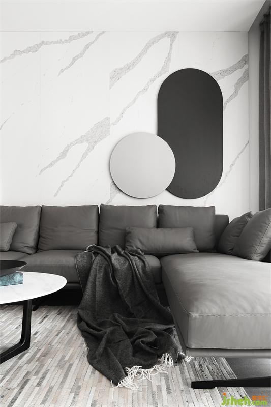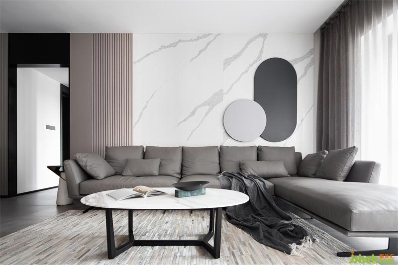 沙發(fā)背景墻由清晰紋理的淺色巖板+灰咖色木格柵及硬包構(gòu)成,其上不再以掛畫作為裝飾,而是由一對圓形鐵藝相互疊加凸顯局部亮點(diǎn)。