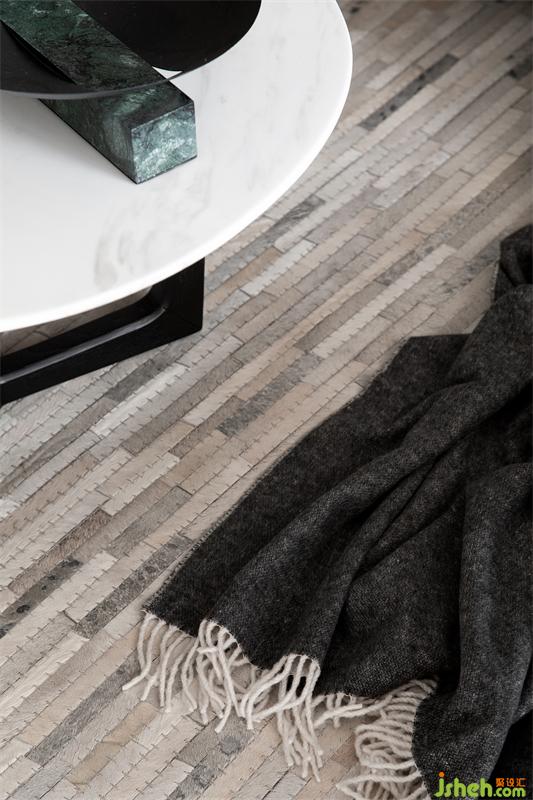 坐感舒適的深灰色L型真皮沙發(fā),搭配淺灰色窗簾和淺灰咖色幾何圖案地毯,在淺灰色地磚和背景墻的襯托下,有一種遠(yuǎn)離城市喧囂的休閑氛圍。