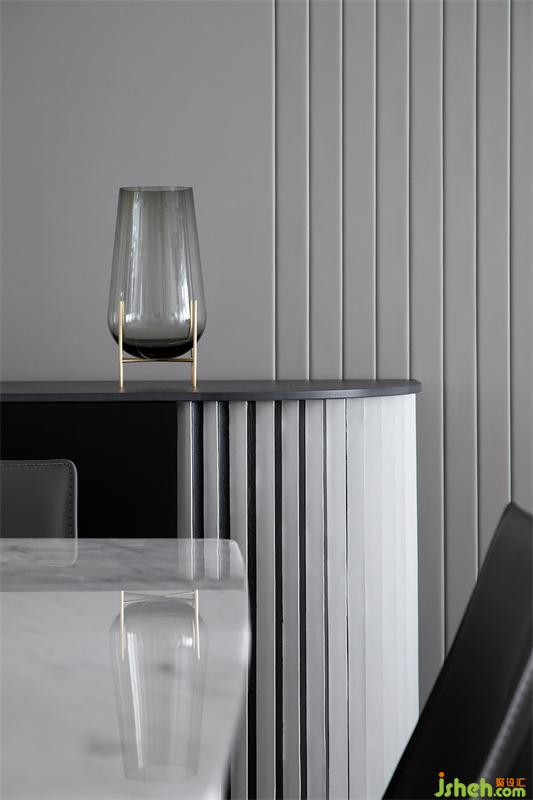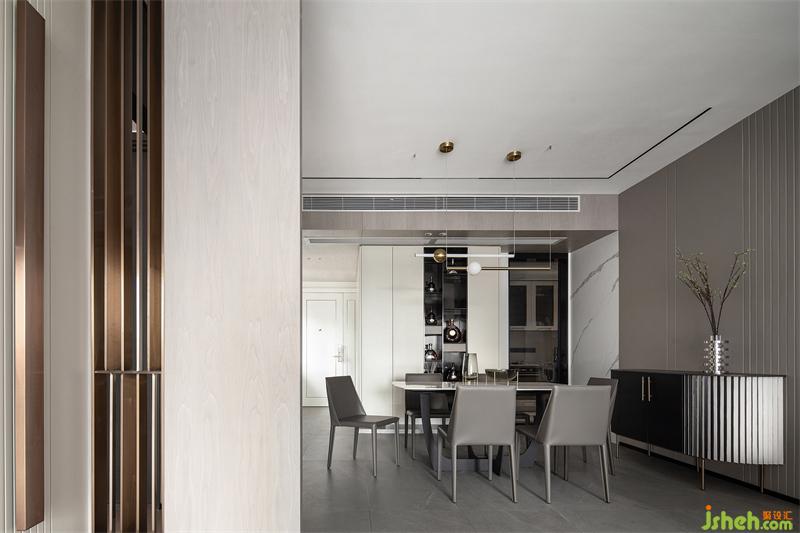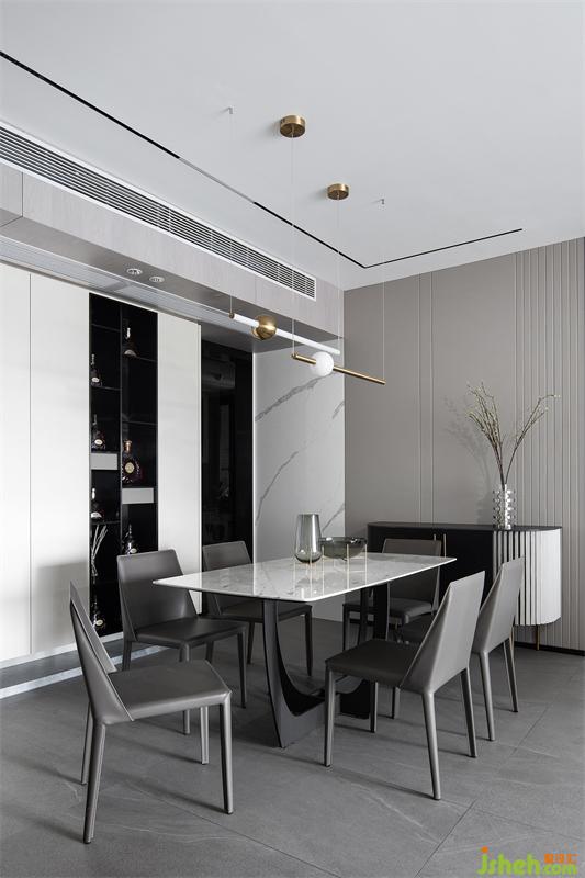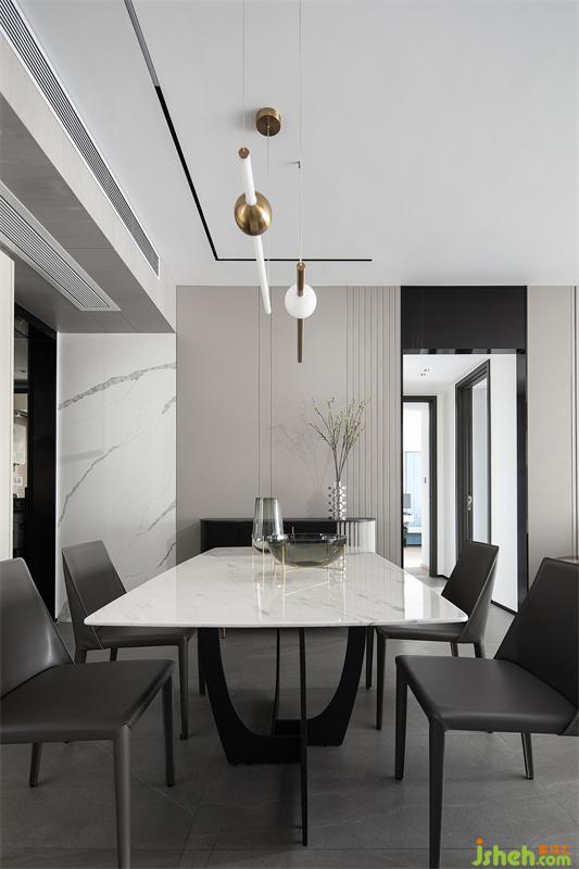 餐廳背景墻延續(xù)沙發(fā)背景墻的巖板+硬包材質(zhì)組合,避免了單一材質(zhì)的乏味。以硬包分縫線、線性幾何吊燈、天花線條磁吸燈等線性元素作為裝飾,同時,引導(dǎo)視線縱向延展,視覺上拉升空間層高,令空間更顯高級、舒適。