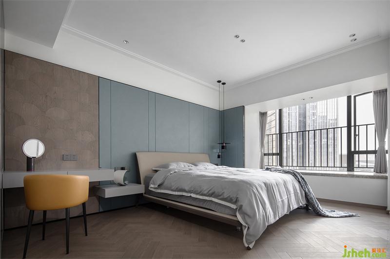 主臥背景墻由咖色鱗紋硬包與霧霾藍分縫硬包構(gòu)成,以顏色巧妙做了功能分區(qū)??珜?yīng)著梳妝、辦公區(qū)域,定制了極簡的條形收納柜,與床連接處則靠下定制了充當床頭柜功能的條形收納柜,少而精的元素令臥室更具設(shè)計感和舒適性。
