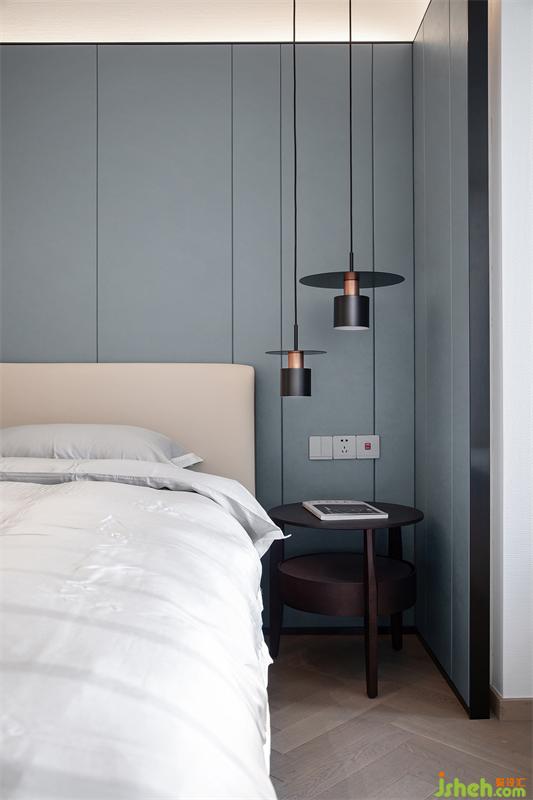主臥背景墻半包圍的造型也使室內(nèi)洋溢著安全而溫馨的氛圍,搭配上方內(nèi)藏的燈帶和側(cè)邊的帽型吊燈,安睡好眠的空間渾然天成。