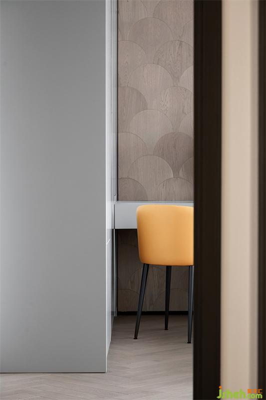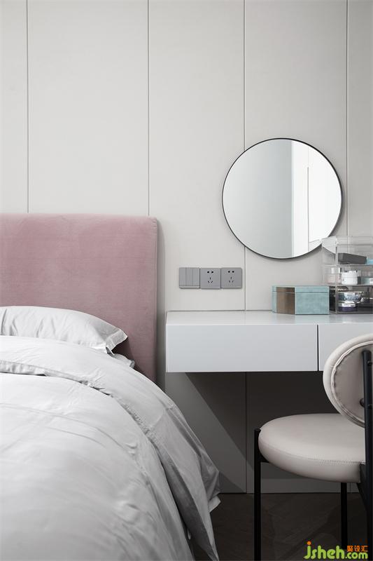 側(cè)面定制的梳妝臺也兼具床頭柜的功能,外形延續(xù)整體現(xiàn)代簡約的基調(diào),以灰度傳遞精致生活方式。