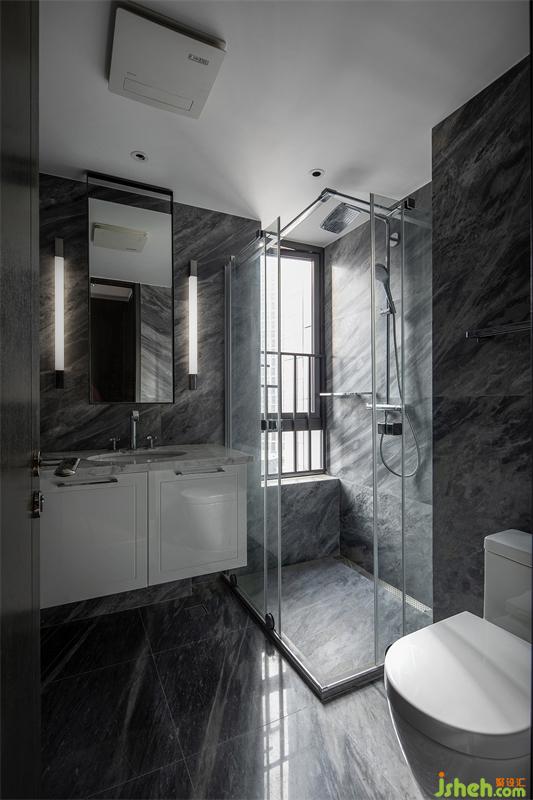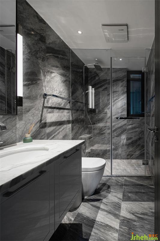 公衛(wèi)墻地面通鋪深色紋理的大理石,潔具選用白色簡約經(jīng)典款,淋浴房則采用極簡的無邊框款式,放眼望去,僅由黑白構(gòu)成的衛(wèi)浴間顯得十分干凈、通透。