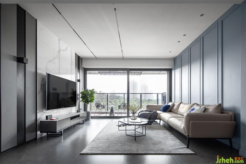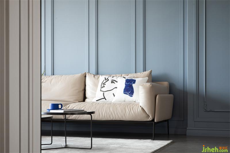 霧霾藍(lán)色護(hù)墻板搭配奶茶色皮質(zhì)L型沙發(fā)、大理石+鐵藝的組合茶幾,每一處都透露著精致與時(shí)尚。不想辜負(fù)大好日光,暫時(shí)還未懸掛窗簾,但預(yù)留了窗簾盒位置,便于后期加設(shè)窗簾。