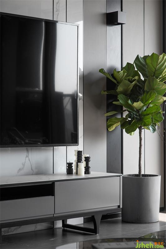 天花、背景墻、家具……線條元素隨處可見,或極簡或硬挺,家居設(shè)計(jì)賦予空間更多層次的質(zhì)感,令有限的空間延展出更大的尺寸感。電視背景墻別具匠心,采用巖板、護(hù)墻板、不銹鋼等材質(zhì)結(jié)合,搭配小株琴葉榕,與自然光影和諧共存,散發(fā)著悠然靜好的氣息。