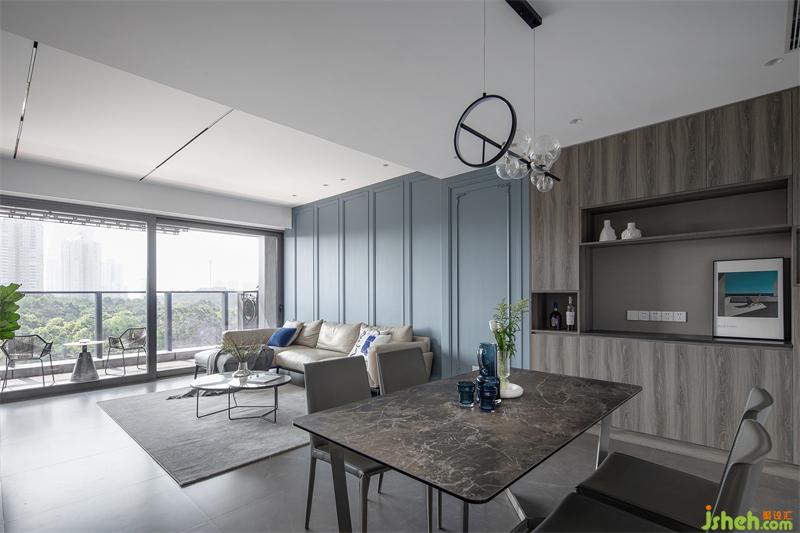 客餐廳以背景墻進(jìn)行功能區(qū)域的劃分。霧霾藍(lán)自帶復(fù)古濾鏡,將周邊一并卷入朦朧美感之中,文藝范兒十足,隨意一拍就是大片即視感。