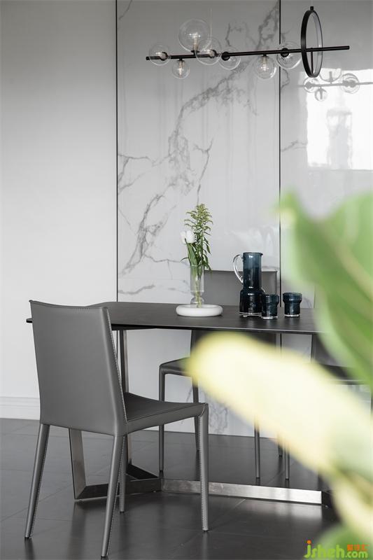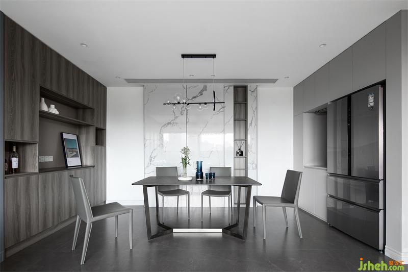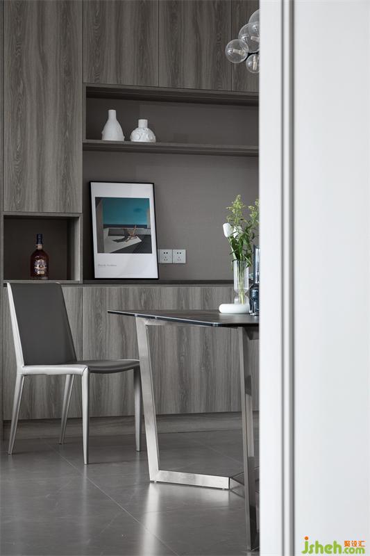 透過大面積落地窗迎接自然光入住,光、影、材的相互映照,視覺上越發(fā)和諧,營造理性內(nèi)斂的奢華感。以高級(jí)灰為主基調(diào),搭配紋理清晰的木飾面餐邊柜,整體干凈素雅、通透高級(jí)。