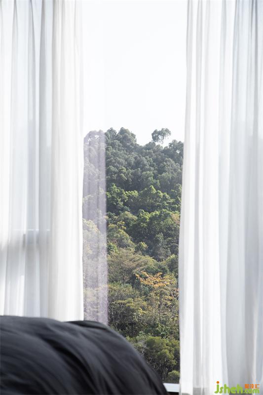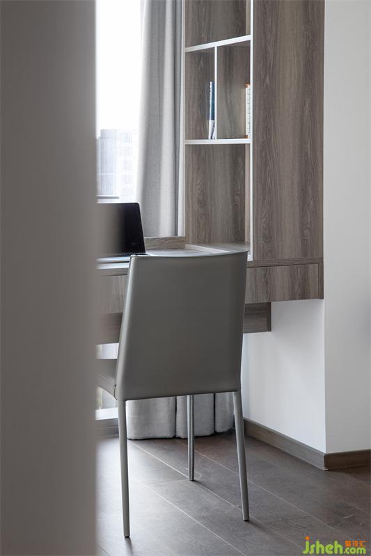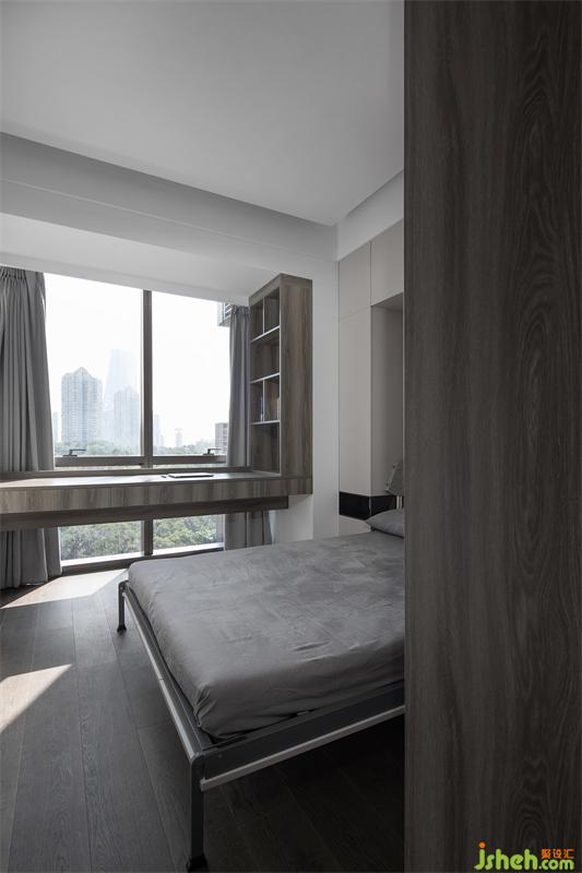書房也是臨時(shí)的客房,以翻板床+書桌形式滿足多重功能需求??看岸ㄖ埔徽艜溃樠亓何欢ㄖ埔回Q排書柜,既增加了收納空間,也解決了書桌受力問(wèn)題。在這里,采光好、景色好、視野開闊,就連辦公都十分愜意。