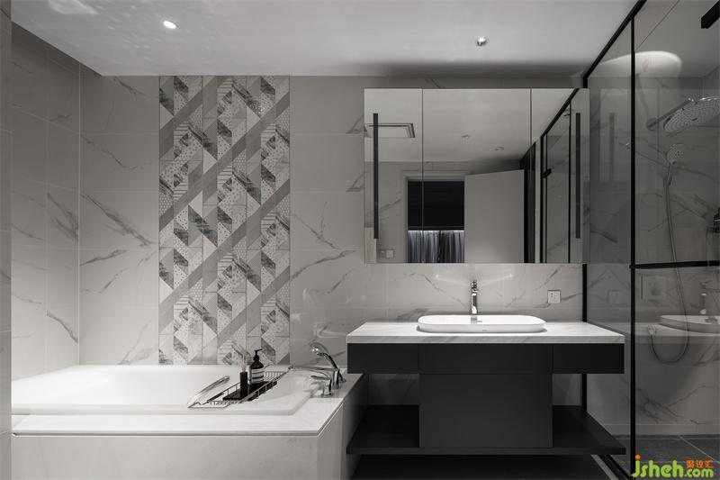 衛(wèi)生間自然清爽之中又不乏創(chuàng)新,局部拼花墻磚格外吸睛,黑白灰中性色的使用令空間更顯高級(jí)。白色的浴缸增加了沐浴的舒適感,讓人十分愜意、放松。
