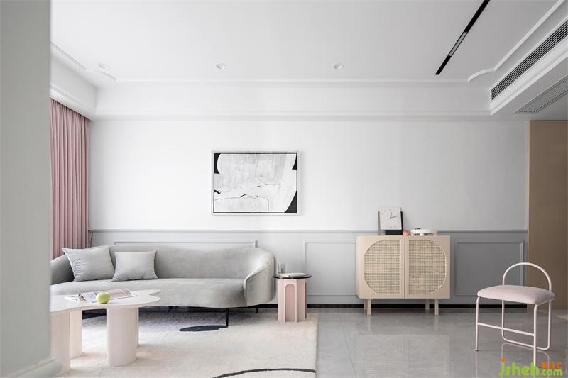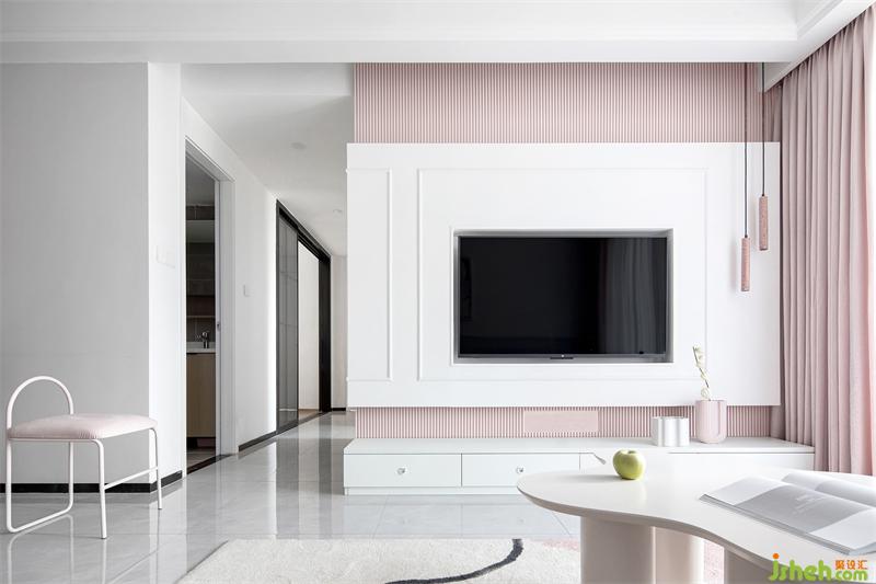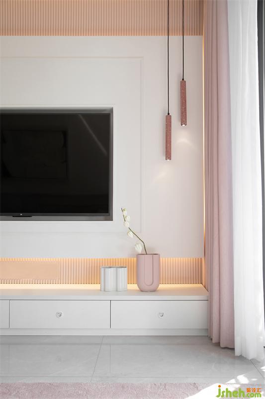 客廳電視墻采用幾何線條與塊面穿插的設(shè)計(jì)手法,以臟粉色格柵做銜接,結(jié)合白色相框型護(hù)墻板和白色電視柜,形成連而不斷的視覺(jué)感。電視墻上下留空減輕視覺(jué)壓抑感,電線設(shè)備等隱藏在電視機(jī)后方,打開(kāi)內(nèi)嵌燈帶,點(diǎn)亮一室溫柔。