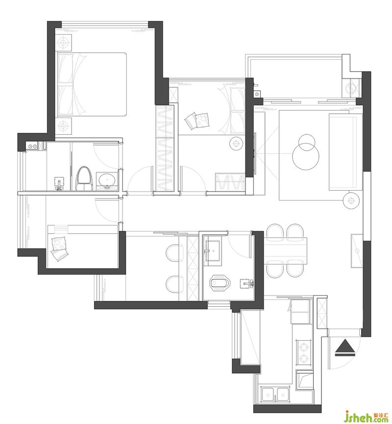 本案就是一個(gè)令人羨慕的三世同堂之家。業(yè)主是一對(duì)年輕的小夫妻,他們和父母、孩子共同居住,希望新家能保有各自生活空間,同時(shí)兼顧大家庭共享團(tuán)圓的場(chǎng)景需求。設(shè)計(jì)風(fēng)格不需要太花哨,以干凈簡(jiǎn)潔、好打理為主,希望融入喜歡的臟粉色,給家里增添甜蜜、溫柔感。功能方面需要增設(shè)一間供兩人辦公的獨(dú)立空間。