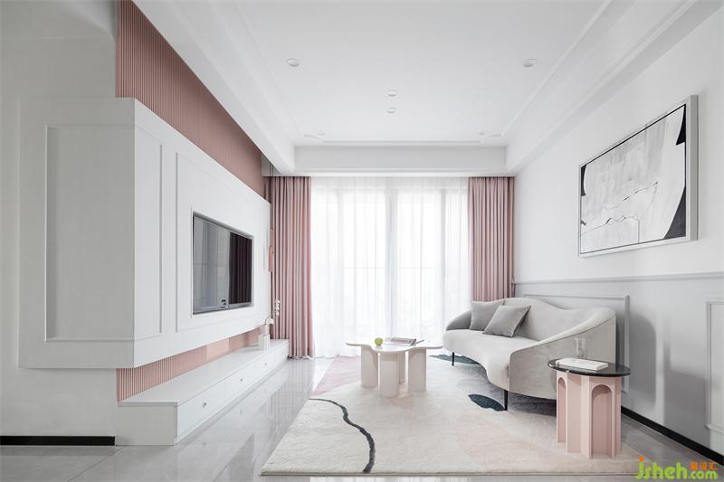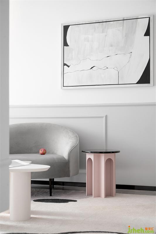 高級灰環(huán)抱式布藝沙發(fā)搭配臟粉色烤漆邊幾,溫柔可愛的氣息撲面而來。臟粉色有一種跨越年齡的輕熟魅力,于高級灰和白色之間點綴,使空間呈現(xiàn)高級的甜美。