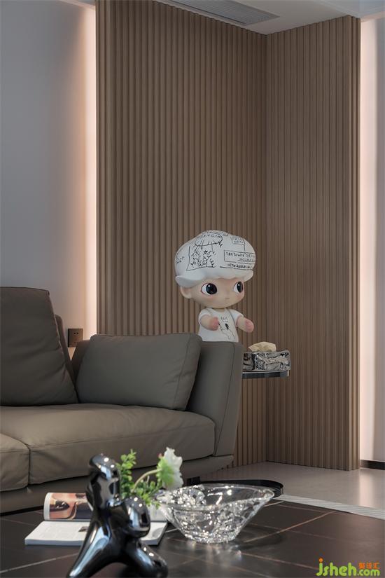 奶呼呼的潮牌玩偶誰(shuí)能不愛(ài)呢!一定要擺放在最醒目的位置!木格柵從沙發(fā)墻連接到轉(zhuǎn)角位置,內(nèi)嵌燈帶使得這個(gè)角落更有氛圍感。