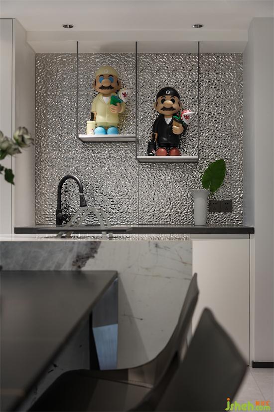與簡(jiǎn)潔的柜子相比,水吧臺(tái)上的水波紋背景墻格外顯眼,與沙發(fā)墻的水波紋墻飾相呼應(yīng),無(wú)形中提升縱深感。深圳家裝設(shè)計(jì)其上設(shè)計(jì)了懸空吊架,可以展示收藏的公仔,美觀又實(shí)用。